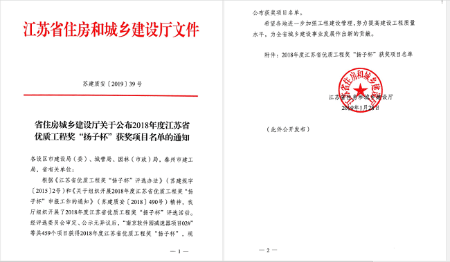 江蘇省住房和城鄉(xiāng)建設廳根據《江蘇省優(yōu)質工程獎“揚子杯”評選辦法》和《關于組織開展2018年度江蘇省優(yōu)質工程獎“揚子杯”申報工作的通知》,經評選委員會審定、公示無異議后,由我公司參建的“蘇州市中環(huán)快速路北段工程”榮獲2018年度江蘇省優(yōu)質工程獎“揚子杯”榮譽稱號。